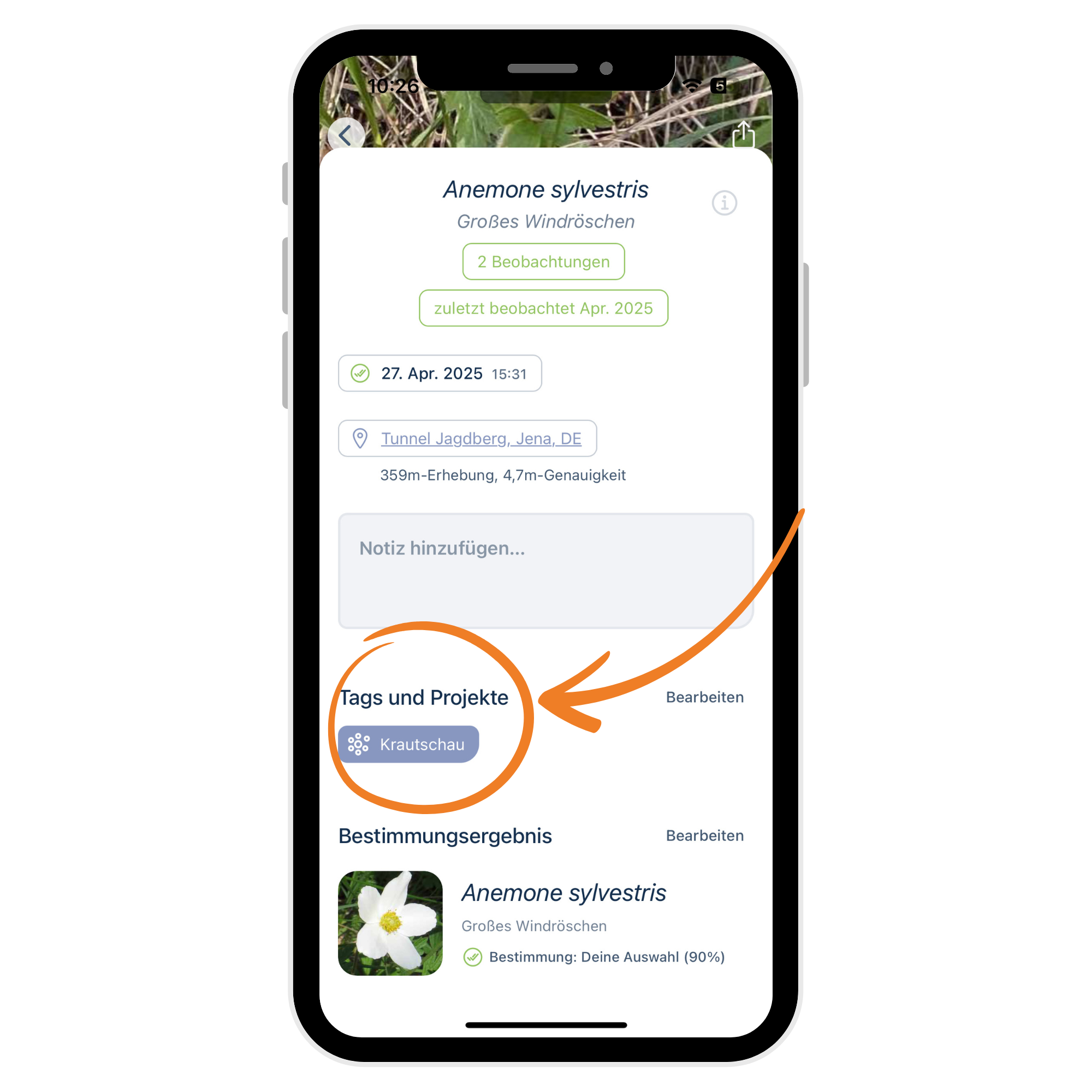Ein Pflanzenfund ist nicht automatisch für ein Citizen-Science-Projekt verfügbar. Um die Beobachtung den Projektverantworlichen zu übergeben, musst Du dem Fund den genauen Tag eines jeden Projekts mitgeben. Mit der Aktivierung des Projekts wurde der dafür notwendige Tag bereits in die App integriert. Du kannst es auf zwei Wegen an die Beobachtung hängen: