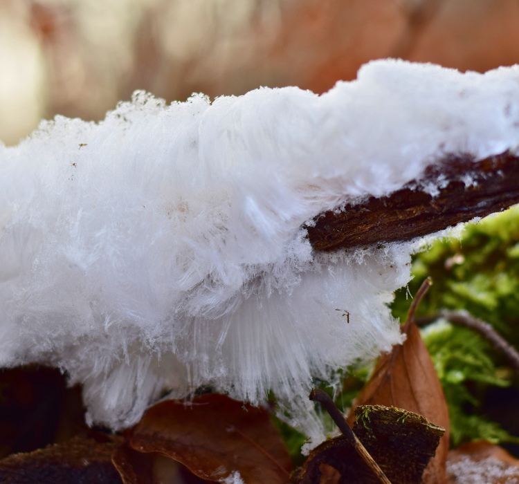 Spaziert man an einem windstillen, kalten, schneelosen Wintertag durch einen Buchen- oder Laubmischwald, kann man an Totholz bizarre Gebilde entdecken, die an Zuckerwatte erinnern: schneeweiße, dichte, wellig gebogene, haarfeine Fäden, die quer zur Achse des Astes an rindenfreien Stellen „wachsen“. Auch hierbei handelt es sich nicht um Spuren von Elfen, sondern was wir sehen ist das Resultat des Stoffwechsels eines Pilzes, der den schönen Namen Rosagetönte Gallertkruste (Exidiopsis effusa) trägt. Sein aerober Stoffwechsel produziert Gase, die das im Holz vorhandene Wasser an die Oberfläche verdrängen, wodurch „Eisfasern“ entstehen, die 30 – 100 mm lang und zum Teil nur 0,02 mm dick sind. Das Haareis dient dem Pilz vermutlich als eine Art Frostschutzmittel, da das Wasser nicht im Ast, sondern außerhalb gefriert und dabei Wärme entsteht.