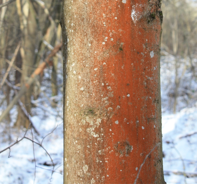 Auf der Rindenoberfläche von Bäumen sind seit einigen Jahren mehr oder weniger intensiv ausgeprägte orangerote Beläge zu beobachten. Auffällig ist diese Erscheinung vor allem in der Nähe von Gewässern, aber auch in kühlen schattigen Niederungen mit einer hohen Luftfeuchtigkeit. Es handelt sich hierbei um eine Besiedlung mit Schuppengrünalgen (Trentepohliaceae). Diese Luftalgen (Aerophyten) können außerhalb des Wassers wachsen und decken ihren Feuchtigkeitsbedarf allein über den Regen oder eine hohe Luftfeuchtigkeit. Ihre orangene Farbe entsteht durch die in Öl gelösten Carotinoide, welche das Chlorophyllgrün überdecken. Diese Algen sind Zeigerpflanzen, und ein Indiz für den Rückgang der sauren SO2-Emissionen und die Zunahme der stickstoffhaltigen Emissionen in den vergangenen Jahrzehnten. Die Besiedelung der Rindenoberfläche durch Grünalgen hat keine negativen Auswirkungen auf den Stoffwechsel des Baumes und stellt lediglich eine optische Auffälligkeit dar.