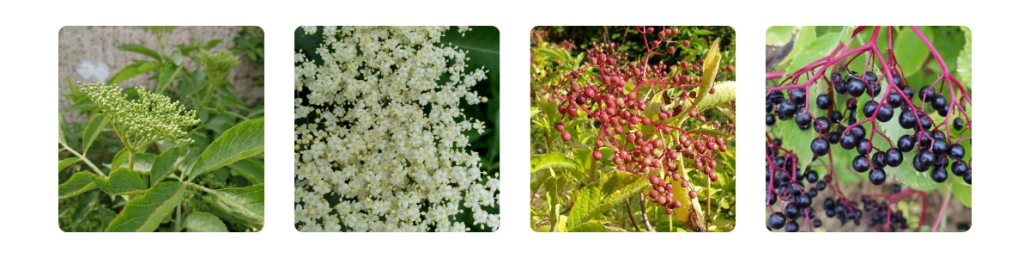 Phänologische Stadien von Sambucus nigra: Knospe, Blüte, unreife Frucht, reife Frucht (von links nach rechts)