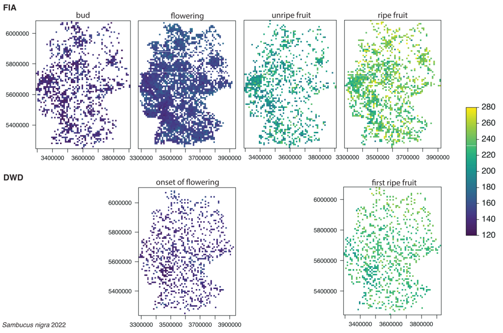 Beobachtungen von Holunder (Sambucus nigra) in Deutschland ermöglichen eine detaillierte Überwachung der phänologischen Stadien. Oben: Automatisch annotierte Pflanzenbeobachtungen von Flora Incognita; unten: systematisch erfasste Stadien durch den Deutschen Wetterdienst (DWD). aus: Katal et al., 2025