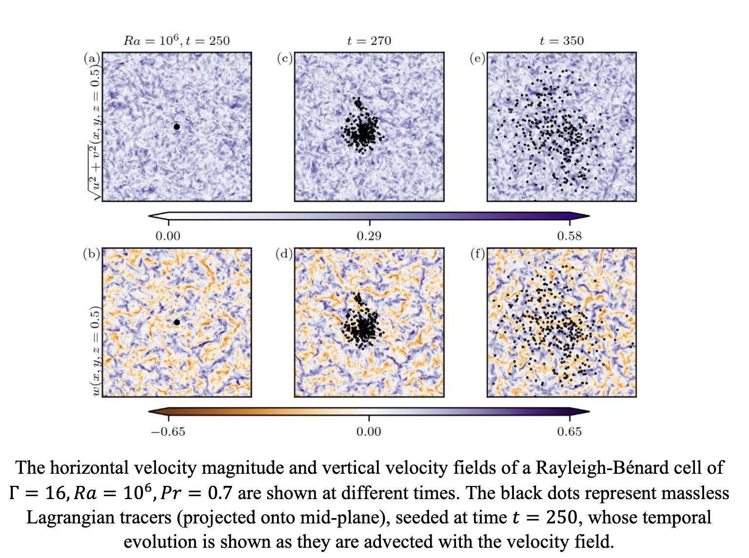 Ein erster Schritt ist in der Abbildung dargestellt. Direkte numerische Simulationen einer Rayleigh-Bénard-Konvektionsschicht mit großem Aspektverhältnis (Γ = L/H = 16) werden mithilfe der Lagrangian Particle Method (LPM) durchgeführt, bei der die Entwicklung einzelner Partikel im Strömungsfeld verfolgt wird. Diese Simulationen dienen als erstes Ersatzmodell für atmosphärische Bedingungen und bilden damit die Grundlage für die Entwicklung eines generativen Modells, das zukünftig zur Verfeinerung der Pollenverbreitungsprognosen eingesetzt werden kann.